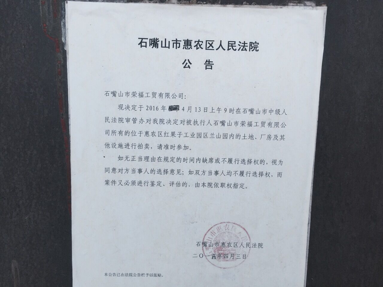 受石嘴山市惠農(nóng)區(qū)人民法院的委托,本公司定于2016年5月19日(星期四)15時舉行拍賣會對位于惠農(nóng)區(qū)紅果子鎮(zhèn)蘭山園內(nèi)的土地及地上建筑物、院內(nèi)設(shè)備進行公開拍賣。